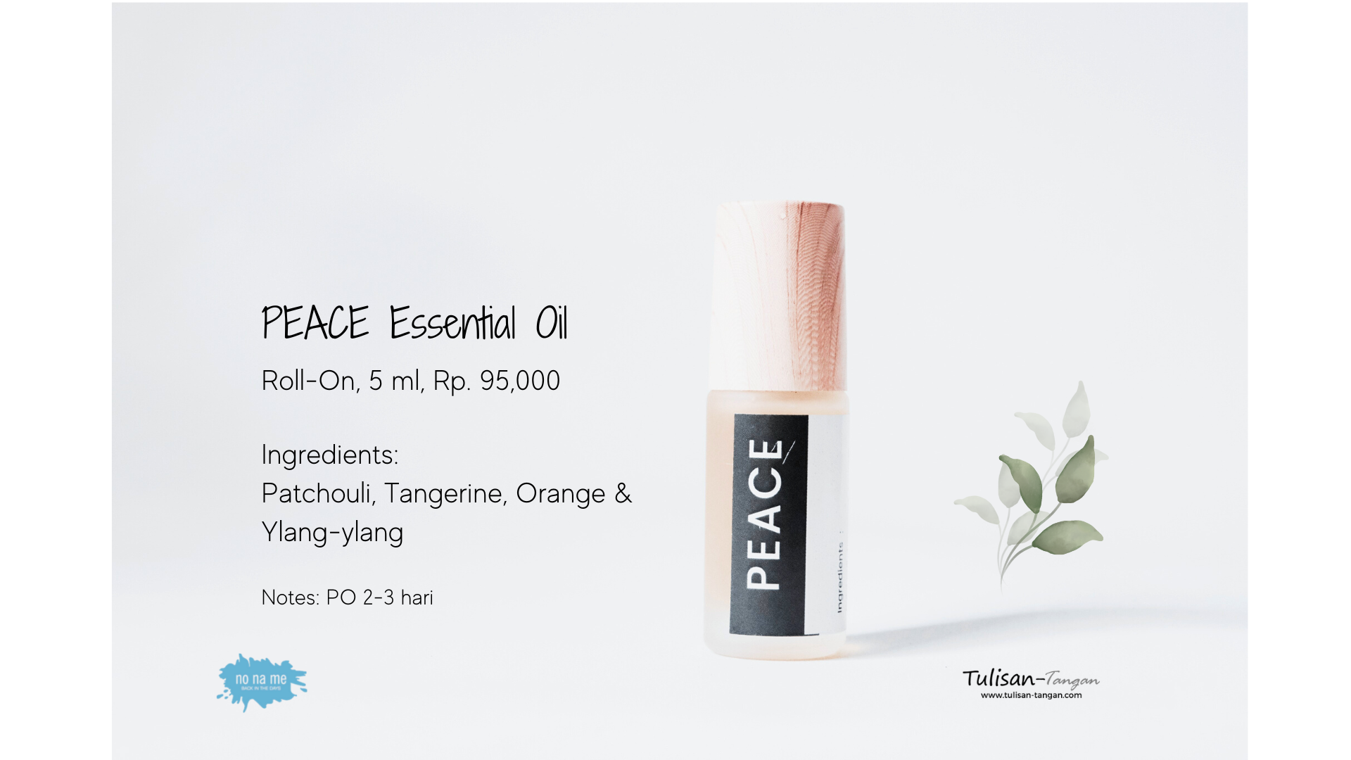 Peace Essential Oil memiliki aroma light fruit dan floral serta sentuhan musky woody scent. Ylang-yiang dan Patchouli memiliki efek ‘to connect with our heart’ & releasing negative pattern. Sementara Tangerine dan Orange memberikan efek melepaskan energy negative agar lebih rileks dan bahagia.
